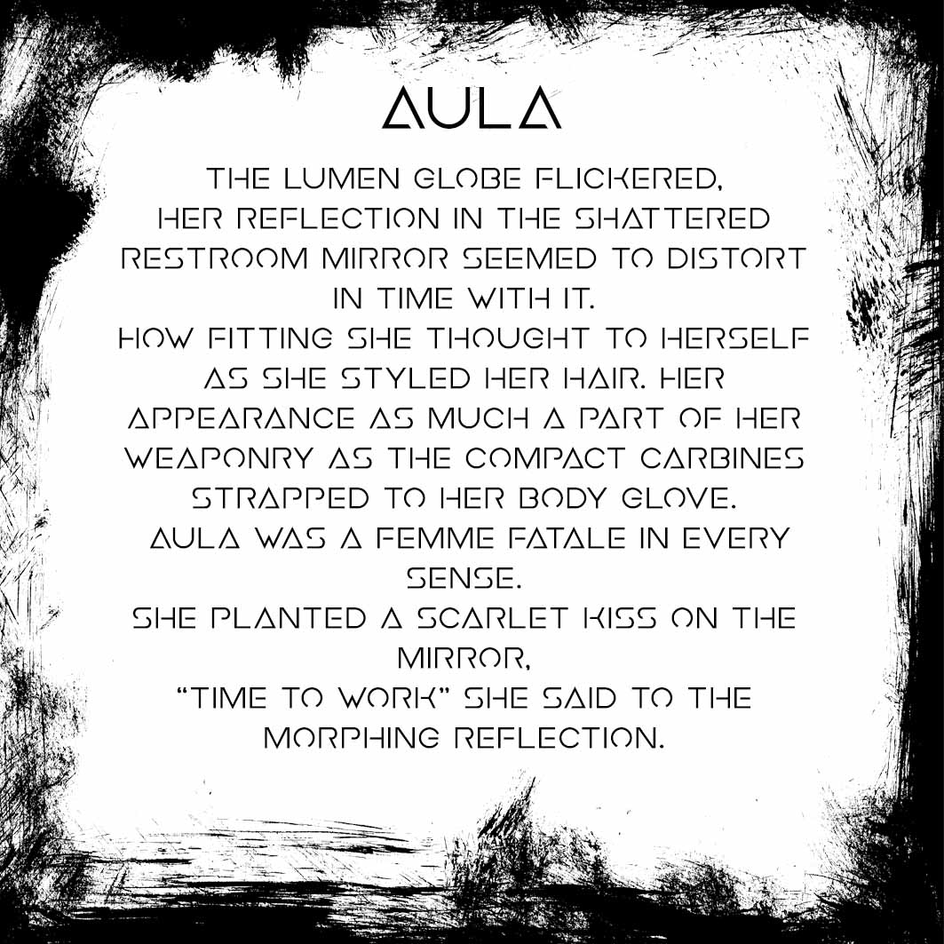 The lumen globe flickered, her reflection in the shattered restroom mirror seemed to distort in time with it. How fitting she thought to herself as she styled her hair. Her appearance as much a part of her weaponry as the compact carbines strapped to her body glove. Aula was a femme fatale in every sense. She planted a scarlet kiss on the mirror, “time to work” she said to the morphing reflection.